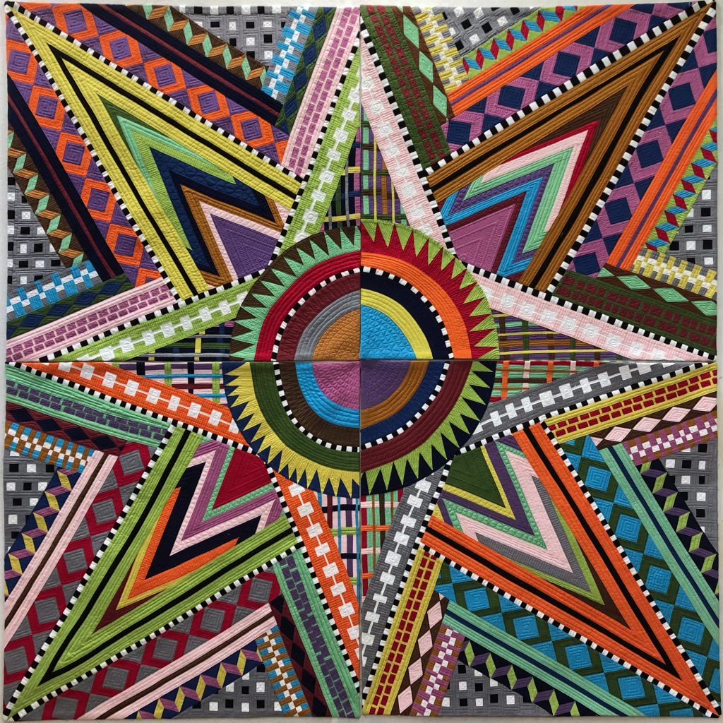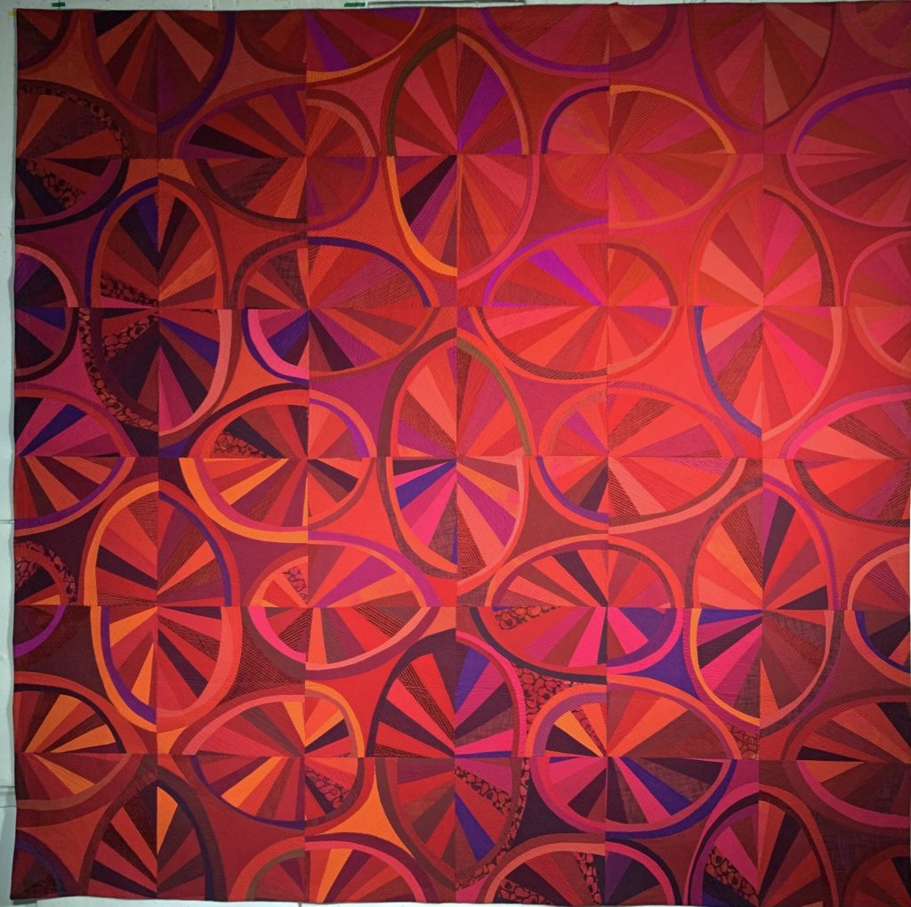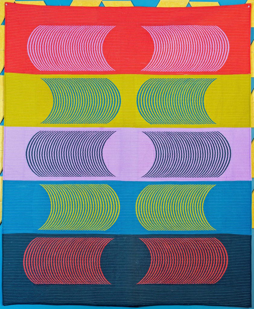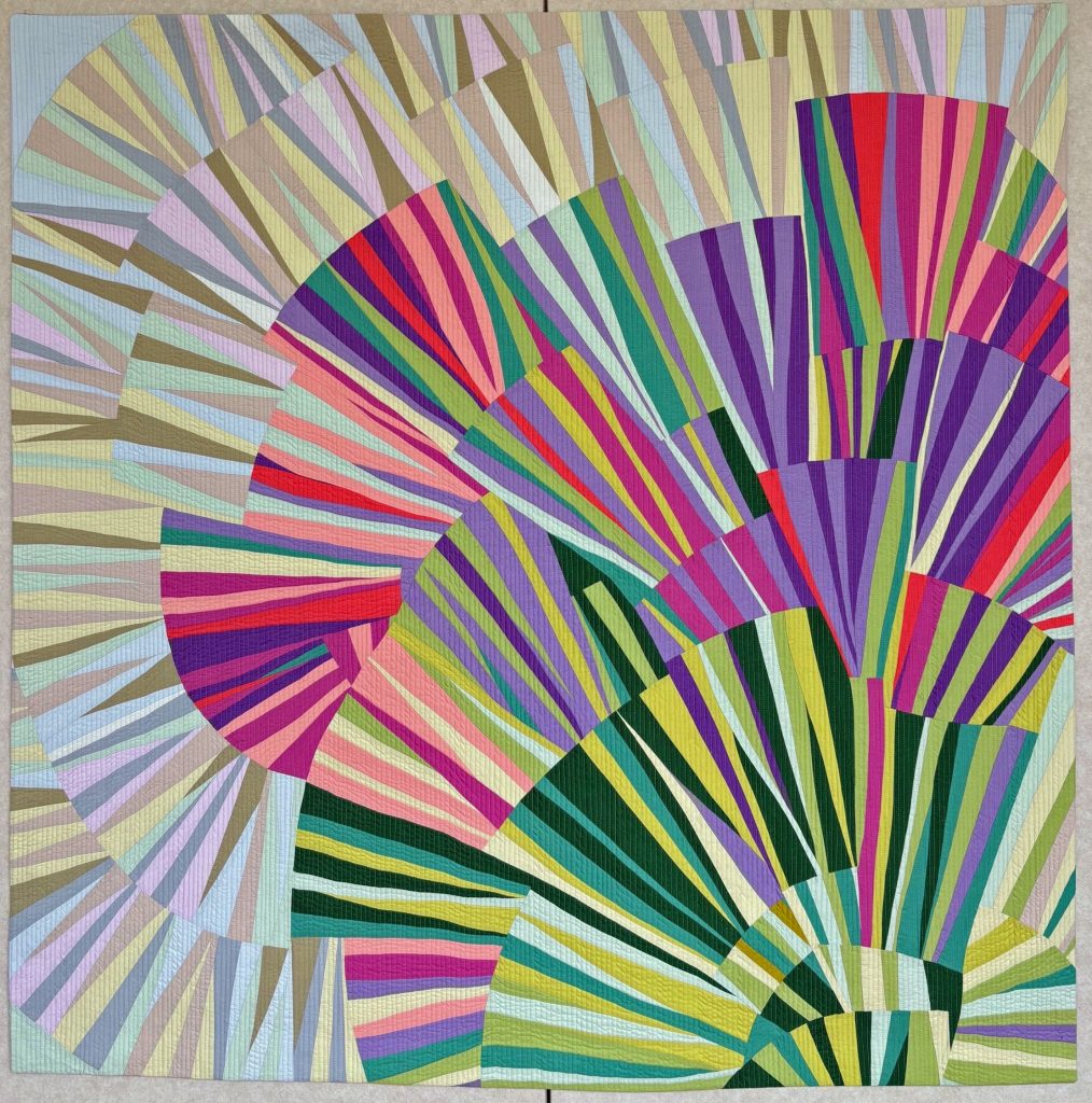 Artist Statement: Cheshire was inspired by pushing boundaries with foundation paper piecing—how far and how extreme can you take this technique?! Five colors were selected after being designed digitally. The fabric was then cut via a laser cutter and foundation paper pieced. It was quilted on a longarm.