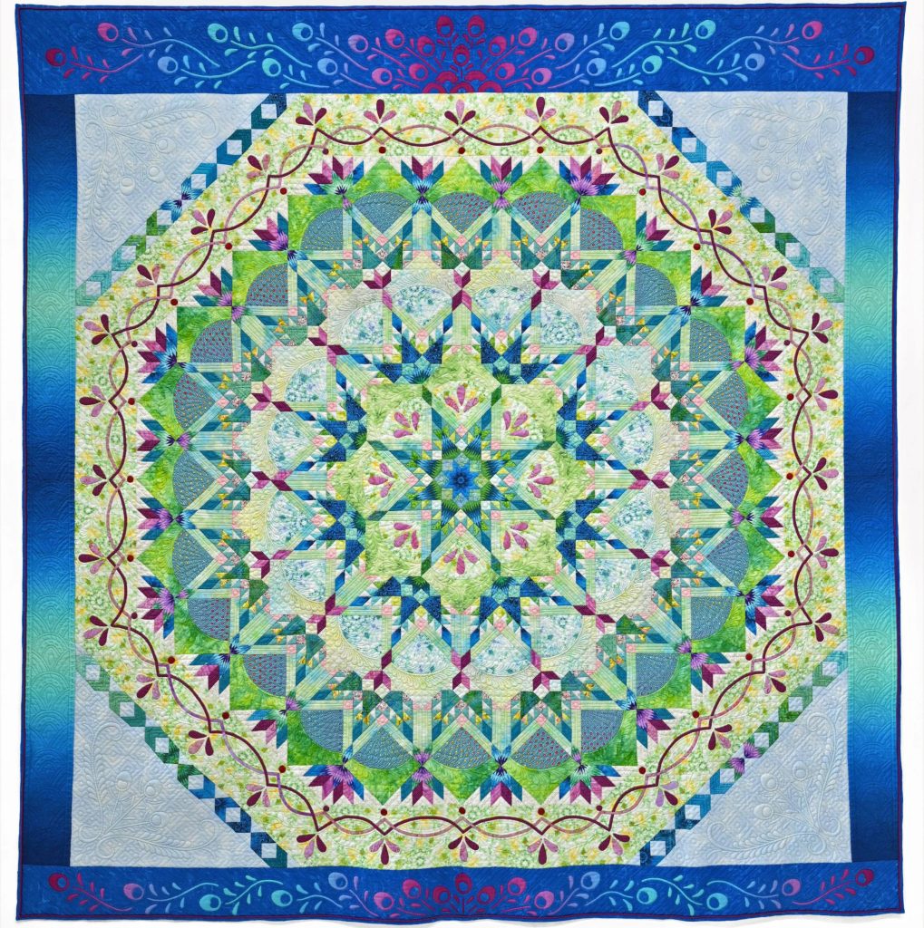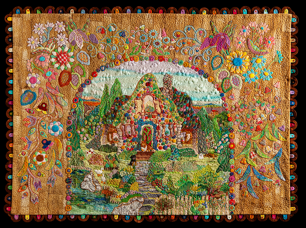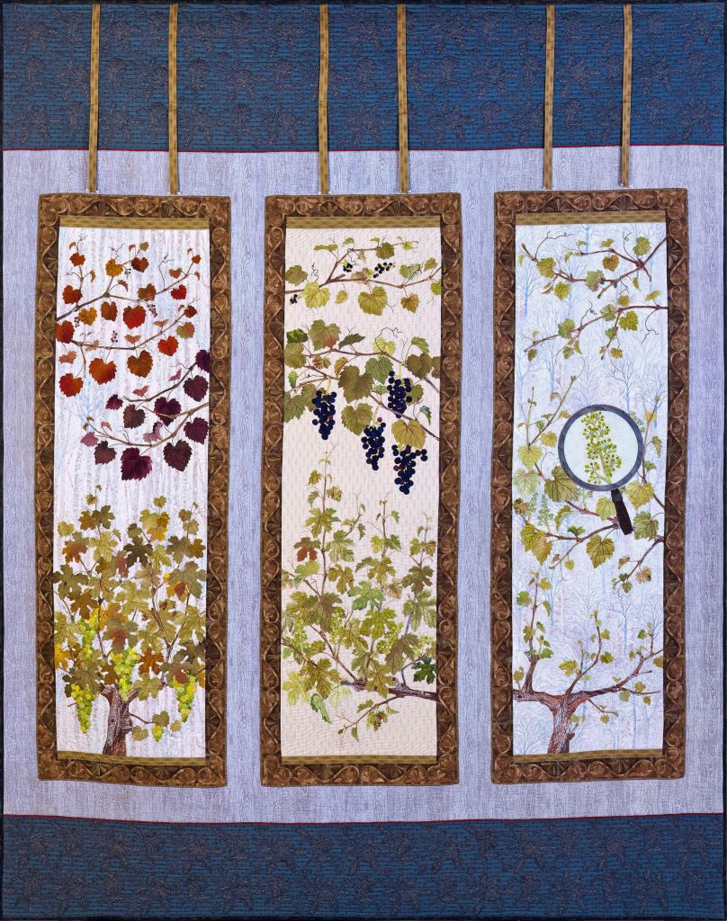 Techniques: Hand embroidery, dyeing, and painting; machine piecing, appliqué, embellishment, embroidery, and quilting; original digitized quilting; digital printing; professional fabric printing