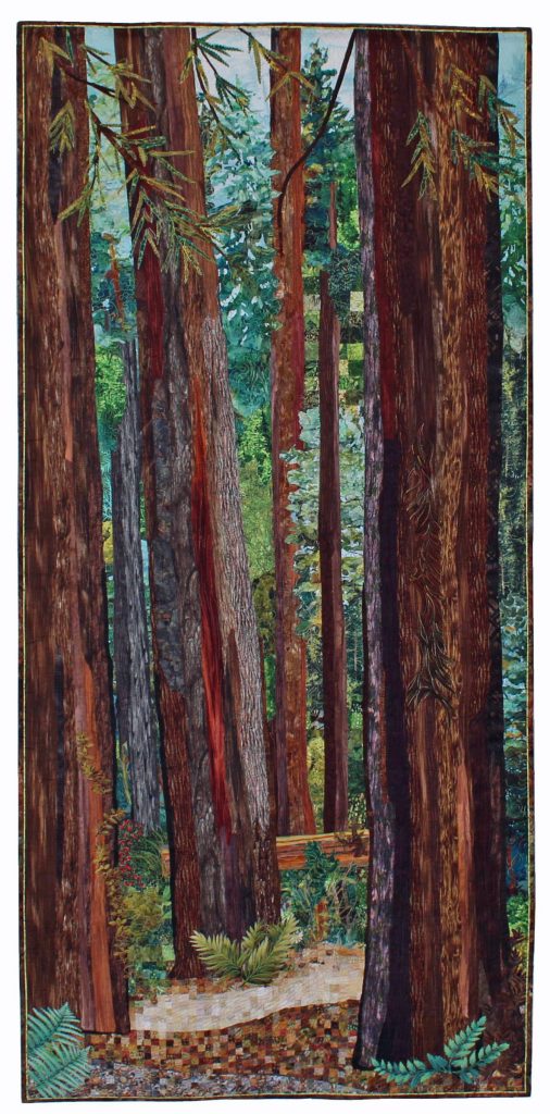 Artist Statement: Love for the redwood forest is my inspiration. I enjoy trying to draw the viewer into the forest to enjoy the view. My unusual techniques help me to use a lot of fabrics to piece together a picture. I hope you enjoy it.