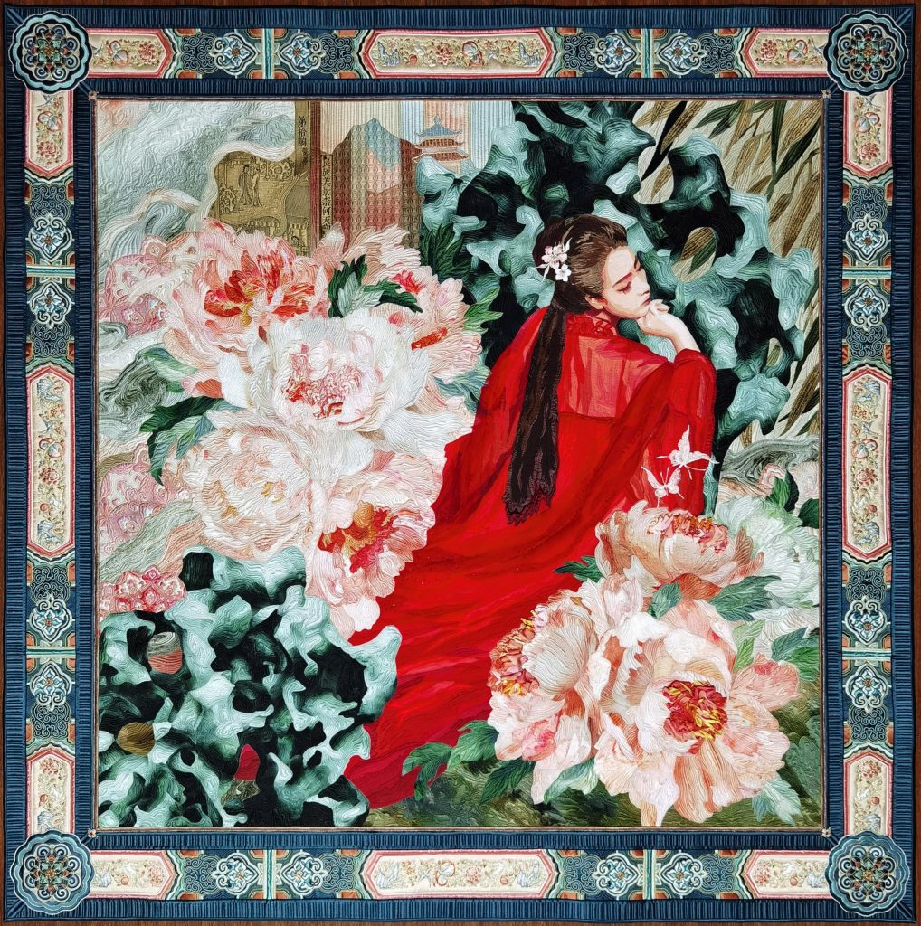 Artist Statement: This quilt draws inspiration from The Peony Pavilion, a classical Chinese opera about love transcending mortal bounds. It depicts a young maiden, enchanted by a spring garden’s blooms, drifting into a dream where she meets an elegant young scholar. The work interweaves realistic human figures with illustrations and calligraphic elements from ancient Chinese books, alongside symbol-laden patterns, using silk and sheer fabric.