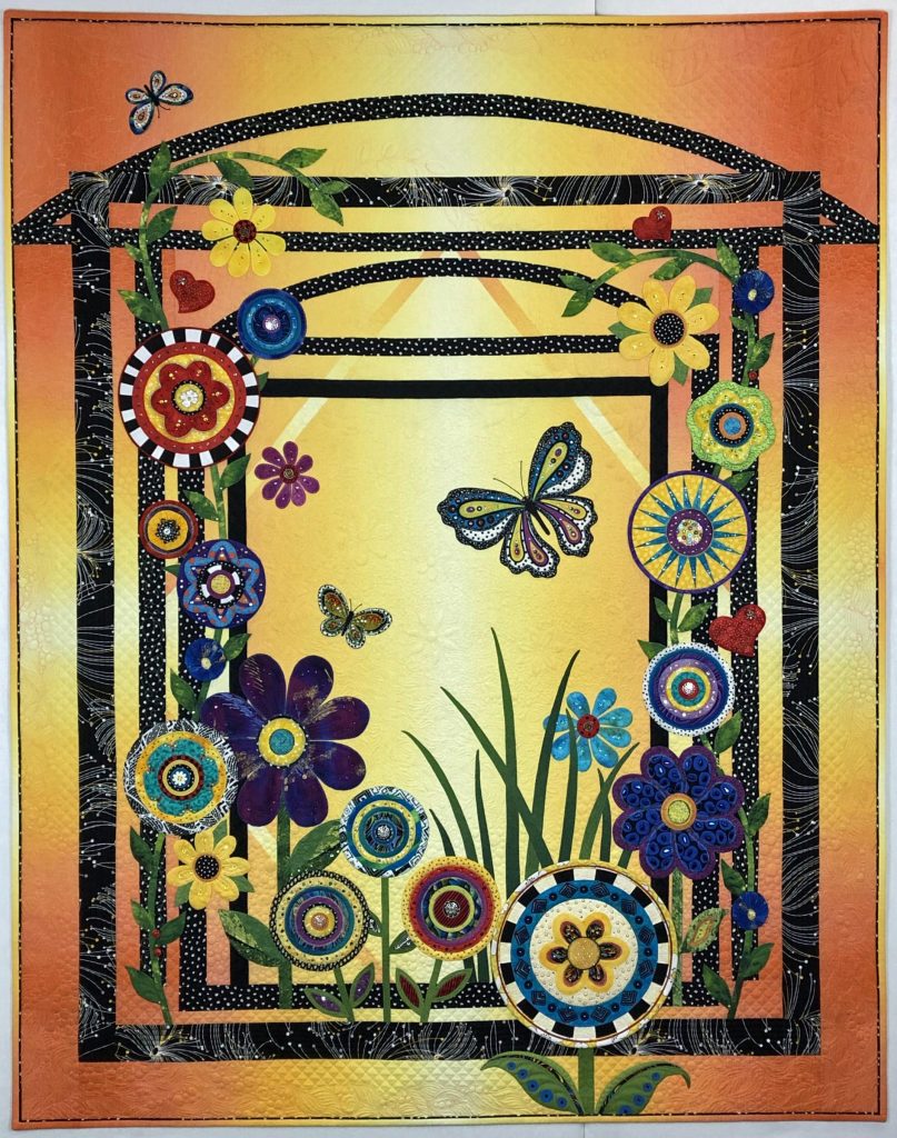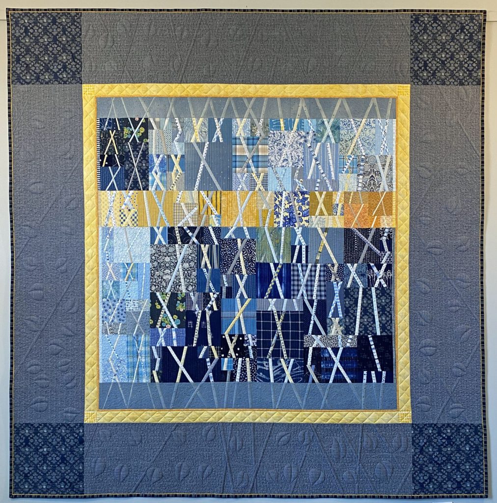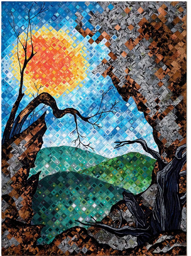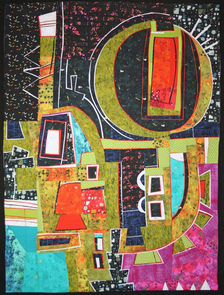 Artist Statement: I began this quilt just playing with bits of hand-painted fabric and scraps from previous projects, adding and deleting design elements as I worked and building shadow with discharge and quilting. I enjoy working with the design-as-you-go process. I had no idea what to name the finished quilt, so I sent out a “name that quilt” plea to my family. My granddaughter, Claire, named it. Thanks, Claire!