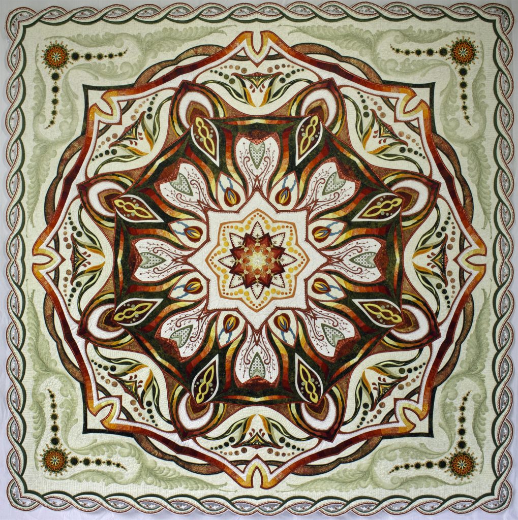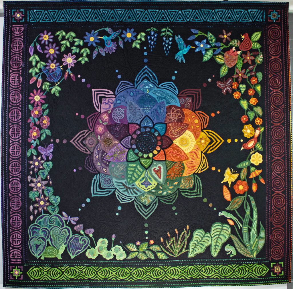 Artist Statement: This quilt was based on a medicine wheel, with spiritual symbols from across cultures and time. The East stands for enlightenment, the South for plants and emotion, the West for earth and ancestors, and the North for the wind, thunder, and animals. It was bound with a hand-appliquéd Sawtooth binding that extends the colors for each direction to the edge of the piece.