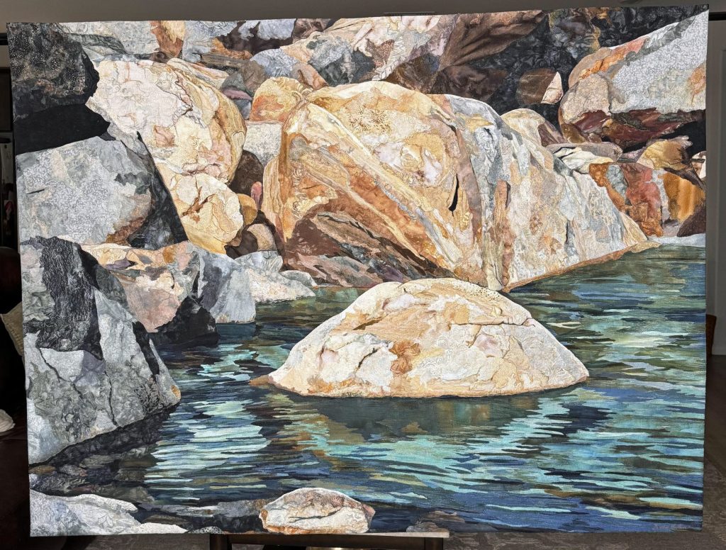Artist Statement: This raw-edge fused collage quilt is based on a photo I took while hiking in Yosemite National Park. I love the intimacy of small landscape quilts that draw in the viewer. I wanted to show reflection, and transparency, and movement of the water, as well as the texture and color of the rocks. Small amounts of mixed media were added for realism.
