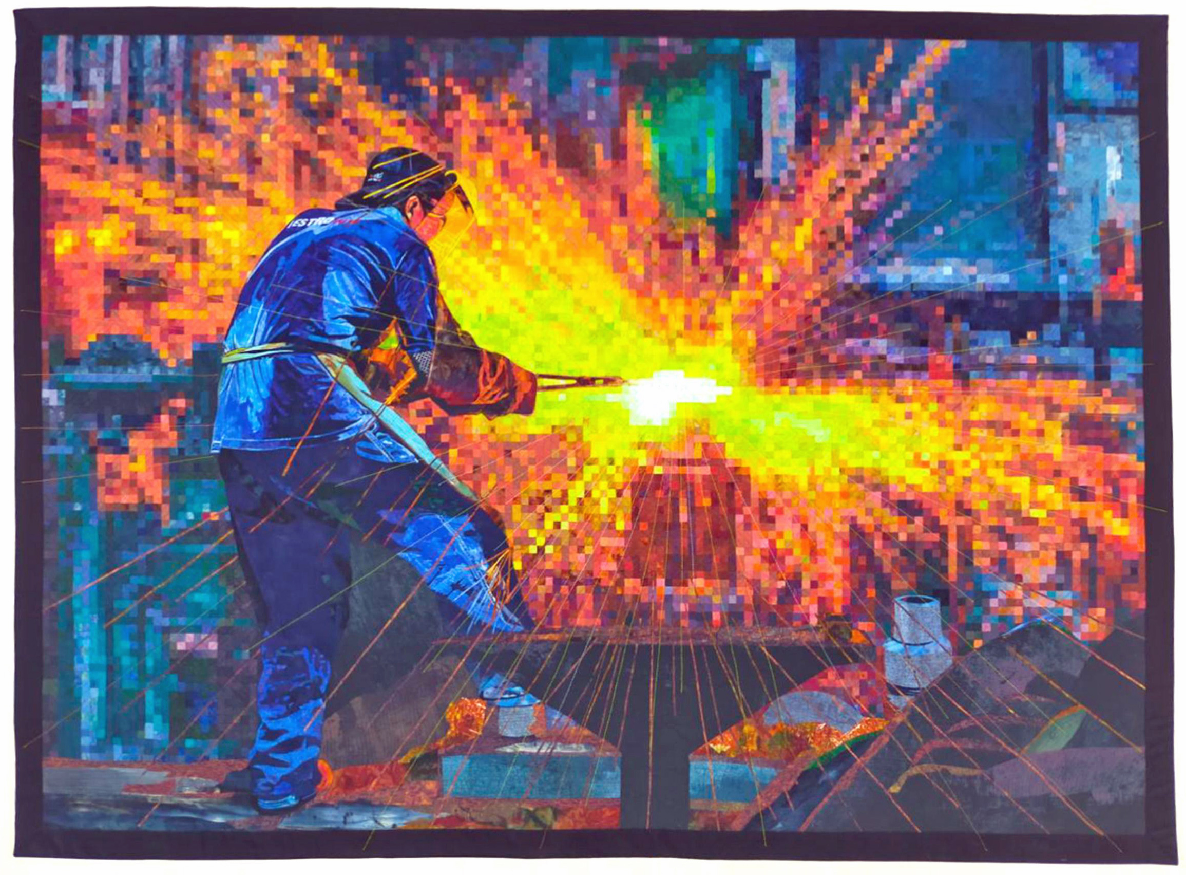 Artist Statement: Depicting a Kinmen blacksmith forging steel amidst a burst of sparks, this piece symbolizes the fusion of traditional craftsmanship and contemporary art, paying tribute to artisanal spirit and cultural heritage. Using mosaic patchwork and tonal separation, the work highlights the contrast between heat and focus. Each fabric piece mirrors every strike of the hammer—layering tradition, craftsmanship, and passion.