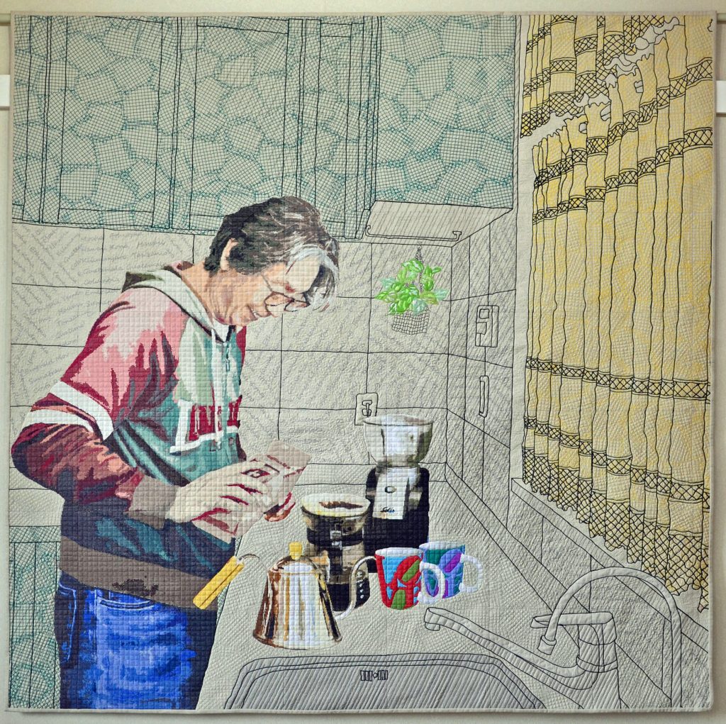 Artist Statement: One of my husband’s pleasures is carefully grinding and brewing coffee to serve to the family. Enjoying a cup of coffee with him is my mellow time. The theme of this piece is a scene from a calm, everyday afternoon with the aroma of coffee in the air. I designed it with moderate contrast to make the soft light shining through the kitchen curtains stand out. This piece was drawn using only machine embroidery thread colors.