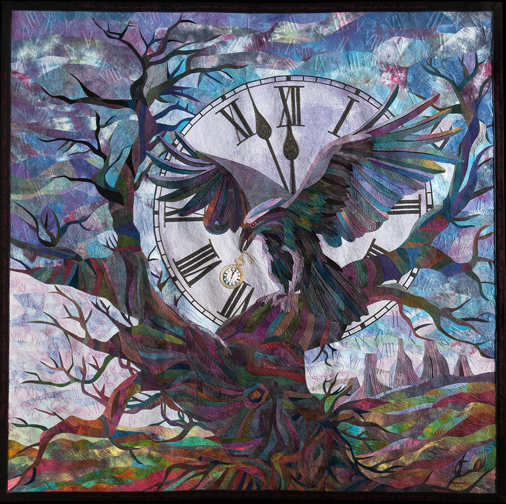 Artist Statement: Original hand-dyed fabrics were assembled using curved piecing (not paper-piecing). The raven was created with bobbin-embroidered feathers and invisible turned-edge appliqué. The moon is from an original photo that was digitized and printed. The raven symbolizes foreboding darkness. The clock suggests using time wisely. The tree represents wisdom, not dead, but dormant. The quilted leaves suggest spring will soon emerge. The time suggests midnight approaches, but a new day will dawn.