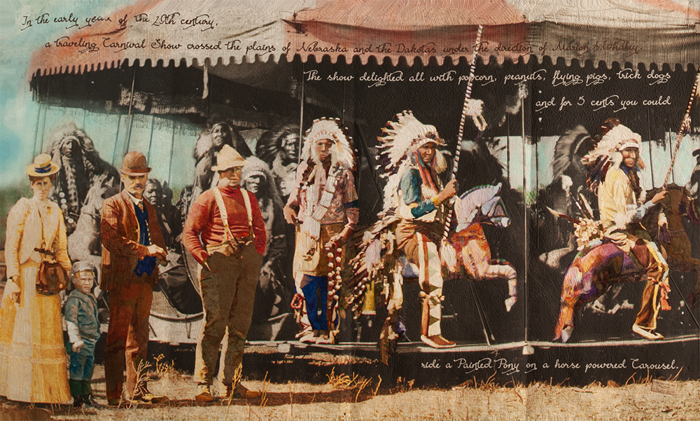 Artist Statement: This image depicts a traveling carnival and horse-powered merry-go-round on the plains of Nebraska and South Dakota during the early 1900s. Attendees of the carnival included Sioux, who enjoyed riding the merry-go-round’s painted ponies. The carnival was operated by Marion and Edith Whaley, my husband’s great-grandparents. The Sioux became fond of the Whaleys and gifted Edith with moccasins for her tired feet and a beaded purse to hold tickets.