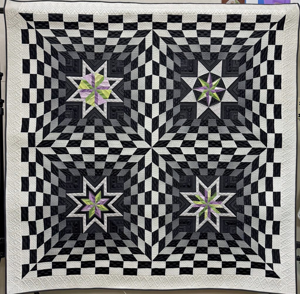 Artist Statement: I experimented with modern design and gray values of cotton fabrics. Traditional star blocks and the surrounding area were designed in EQ8 and paper pieced. The black fabric is Radiance to create a crisp/shiny look.