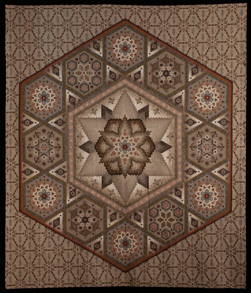 Artist Statement: About 10 years ago, I started working on a hexagonal quilt, but stopped halfway through because it had too many pieces. Four years ago, I started working on this quilt again and was finally able to complete it. The number of hexagonal pieces used to complete this quilt was 30,833. All the hexagonal pieces were quilted in rocking stitch, and each side of the hexagonal paper liner is 8mm long.